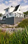 I HØYDEN: Hytta ligger høyt på et svaberg. Det gjør stedet værutsatt, men er også en fin beliggenhet for å nyte solnedganger i havet. Rekkverket i herdet glass tar vare på utsikten.Kathrine Sørgård