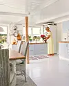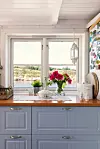NATUREN INN: På godværsdager er det herlig å sette opp dørene og la havbrisen fylle hytta. Fra kjøkkenet ser man storhavet bakenfor Seisundet. Den blå fargen tar opp fargene fra havet utenfor og forsterker nærheten til kysten.Kathrine Sørgård