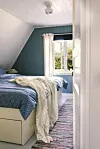 HAVBLÅTT: Selv om soverommet i andre etasje har utsikt mot skogen, markeres nærheten til havet med fargen Fjell 5764/ S4005 - B20G.Kathrine Sørgård
