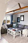 ETTER: Stuen i andre etasje ble ganske så annerledes etter noen runder med malerkosten! Her tilbringes gjerne stormfulle kvelder foran tv-en. Bjelkene er beholdt umalt, fordi de har en fin patina. Veggfargen er Jotun Lady, Chi 7236/0401-G42Y.Privat