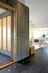 TRE OG BETONG: Inngangspartiet til huset er både åpent og lukket på samme tid. Sampillet melom de harde og myke materialene gir en spenstig, visuell virkning.FOTO: Espen Grønli