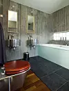 STERKE MATERIALER: Badet helt i enden av huset er også oppsiktsvekkende. Der er det røff betong mot glatte flater hele veien rundt.FOTO: Espen Grønli
