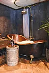DRØMMEBADET: Egentlig ønsket Sigurd seg en ny hytte uten innlagt strøm og vann. Men da han først lot seg overtale av søsteren May Dagmar til å velge mer komfort, planla han og Veronica detaljene nøye. Badekaret i kobber og armaturet er kjøpt via sidsid.se. Kathrine Sørgård