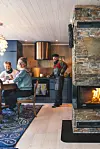 FELLESSKAP: Ann-Sofi og mannen Paul liker å tilbringe tid med søsteren Oda Maris barn. Sofaen er fra gamlehytta. Trekket er det samme, mens bena er malt i blått. Peisen er kjøpt hos Byggmaker, og den holder meget godt på varmen.Kathrine Sørgård