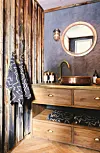 GAMLEHYTTA PÅ BADET: Panelet fra gamlehytta ble tatt med videre. Sigurd har satt det inn med tre lag med olje ment for trebåter, slik at det skal være fuktbestandig. Oljen fikk også frem et dypere fargespill. Benken har han snekret rundt skuffer fra en gammel kjøkkeninnredning. På toppen er det et beslag av messing kjøpt fra en blikkenslager. Servant og kran er kjøpt i Sverige hos sidsid.se.Kathrine Sørgård