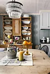 I stua har de et bord fra gamlehytta, som vekker gode minner. Det er pusset ned, oljet og malt stedvis i den samme blåfargen som på kjøkkeninnredningen.