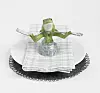 HOPPEFROSK: Brikke i ståltråd, kr 59, Verket Interiør, asjett fra Wik og Walsøe, kr 145, Palma, porselensfrosk fra Royal Copenhagen, kr 525, serviett fra Himla, kr 79 for 2 stk., Backe, gaffel, kr 169, Country Chic.Thomas Lie Larsen