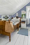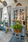 – Vi solgte nesten alt før vi kom hit. I stedet har vi vært på låver, loppemarkeder og bruktbutikker rundt i hele Østfold, og vi har fått utrolig mye fint på Finn, helt gratis. Jeg liker å pusse ned, male og sette i stand gamle møbler, sier Bodil som ikke er noen utpreget minimalist. Alle rommene på Ganerød er temmelig innholdsrike.