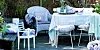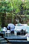 ROMANTISKE VIBBER: Duse pasteller rundt hagebordet! De hvite stolene er designet av Harry Bertoia. Duken er fra gronlykke.com. Den lille stolen er fra Liebe, mens kurvstolen er et loppefunn som er malt grå med spraymaling.FOTO: Tia Borgsmidt