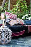 SKAP MAGI: Lag din egen, myke utesofa. Putene er her sydd av libertytekstiler. Et plantebord i hagen er hyggelig. Skap stemning ved å sette blomster, bokser og annen nips på det.FOTO: Tia Borgsmidt