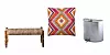 ETNISK TILBEHØR: Benk i jute (husk å ta den med inn etter bruk), kr 1499, bolina.no, kelimpute, 50x50 cm, kr 199, hd.no, og smart vannbeholder for varme dager, 16 liter, kr 899, Granit.FOTO: Produsentene