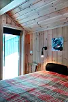 BADSTU: Fra soverommet fører en dør ut til badefasilitetene på baksiden av hytta. Åpningen var opprinnelig tegnet inn som et vindu, men for å skape en enklere tilgang til badeannekset og jacuzzien som ligger mellom hyttekroppene valgte Herdis å sette inn en dør istedenfor. Dørbladet er imidlertid utformet likt og med samme lysåpning som vinduene.Inger Mette Meling