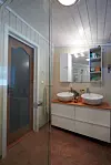 NYTT BAD: Badet, som ligger i den delen av hytta som ikke ble revet, er moderne utformet med doble servanter, et romslig dusjhjørne, vaskemaskin og toalett.Inger Mette Meling