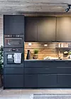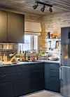 Kjøkkenet er kjøpt nytt på Ikea fordi familien ikke fant noe gjenbrukskjøkken som passet inn, mens komfyren og mikrobølgeovnen er kjøpt brukt.
