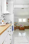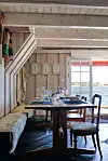 Det er innredet som en fullverdig hytte, med et lite kjøkken og alt man trenger. Bakenfor, mer inn på øya, følger vi en sti i lett, ulendt terreng før landskapet åpner seg. Inn mot berget ligger det gamle småbruket som nå er hytte.