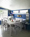 Eierne av hytta ved Lyngør inspireres av sjøen, svabergene, og den knallblå horisonten. Slik er interiøret blitt maritimt blått og hvitt, med innslag av friskt rødt.