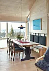 Inne er møblene en blanding av nytt og gammelt. De nye er i all hovedsak fra Ikea. De gamle er brukt og tatt med hjemmefra. Hytta har fått en inngang på midten med soverommene i én ende og opphold i den andre enden. Stue og kjøkken er lagt i åpen løsning, og de har latt spiseplassen få den fineste utsikten.