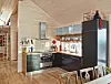 Åpen løsning: Kjøkkenet er svart med glatte fronter. Benkeplatene er i eik og innmaten er fra Ikea. Til venstre er stigen opp til hemsen. Med plassen oppe er det blitt rom for til sammen 14 sengeplasser; åtte fordelt på tre soverom, fire på hemsen og to i koseplassen i stuen.Foto: Sveinung Bråthen