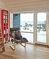 Luftig og lys: Vinduer og dører fra gulv til tak gir mye lys og luft inn i en beskjeden hytte på 75 kvadratmeter. Osp som innvendig kledning: I denne hytta er det osp i taket og på veggene i stuen og i gangen. Osp er en lys tresort uten kjerneved. Å bruke osp innvendig gir derfor lyse og naturlige overflater, noe som igjen kan bidra til å øke romfølelsen. Osp vil dessuten ikke gulne fordi den ikke inneholder harpiks. Osp blir også sett på som motstandsdyktig mot insekter og husbukk. Den er myk og skal ha svært gode akustiske egenskaper.Foto: Sveinung Bråthen