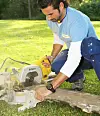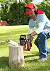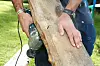 4. Til bordbein brukte snekkeren en rund trestamme som han delte i to med motorsag. Det er viktig at stammen blir kuttet rett.