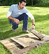 5. La bordplaten ligge slik at de tverrgående trestykkene vender opp. Plasser de to beinstykkene oppå dem.