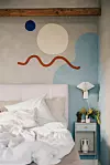 VEGGMALERI: Beboeren har malt et stort veggmaleri direkte på veggen bak sengen, noe som gir et fargerikt kick til den ellers rolige innredningen. Det lille nattbordet er fra traevarer.no, men beboeren har malt det og gitt den nytt håndtak. Vegglampen er fra Le Klint og er kjøpt brukt.Mikkel Dahlstrøm