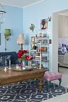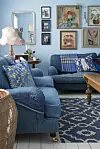 FARGEFRYD: Denne innredningen er som en pose blandet lørdagsgodt! Her mikses stiler, mønstre og farger. Med farger følger glede og kreativitet, mener beboerne, som for tiden har blått som yndlingsfarge. Sofaene fra Englesson er i jeansstoff. Pynteputene er fra Gant, Designers Guild og Day. Sofabordet er et antikt matbord som de har forkortet bena på, mens gulvteppet er fra Udda Tina.Pernille Wästberg