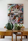 KUNST SOM BLIKKFANG: Kunstverket av Lars Elgidh utgjør et flott blikkfang i denne spisestuen. Det er kjøpt på Blomqvist auksjon, noe også PH-lampen er. På spisebordet står en samling vaser. Den store er av EDG fra Bellas Hus, den mindre av Jonathan Adler og den minste er kjøpt på Galleri Normisjon for 30 kroner.Yvonne Wilhelmsen
