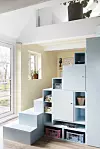 PLASSBYGGET: Den store, blå trappen fikk beboeren laget av en snekker. Den fungerer både som adgang til stuen i andre etasje, og som avskjerming mellom spisekroken og kjøkkenet. Det er også et multifunksjonelt møbel med åpne hyller og skap på hver side av trappen. Barna synes dessuten den er morsom å sitte på. Trappen er malt med gulvmaling fra Beckers med NSC-koden S0520b.P. Wessel