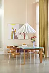 LEK MED PROPORSJONER: Pendelen Dancing Pendant fra Menu har en diameter på hele 95 centimeter og dekker nesten hele bordbredden. Det skaper spenning i interiøret og definitivt en liten wow-effekt. Spisebordet er arvet, stolene er kjøpt brukt, og det samme er litografiet av Erik A. Frandsen. Gardinene er fra Luraflex og den lilla vasen er vintage fra Kosta Boda.Winnie Methmann