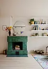 PEIS MED SÆRPREG: Peisen, i håndlagde zellige-fliser fra Ulfven, er midtpunktet i dette allrommet. Speilet over er fra Ferm Living, og på peishyllen står en vase fra Hein Studio og sølvkule fra Milla Boutique, der også skjellet på gulvet kommer fra. Vegghyllene er fra Ikea, teppet fra Volver Studios. Den lune veggfargen er spesialblandet for dette rommet, en lys fersken med like mengder gult og rødt i seg.Yvonne Wilhelmsen