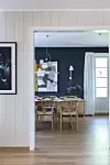 - Jeg liker at bilder ikke får for mye konkurranse. Foruten den mørke fargen på veggen, har spisestuen få fargeelementer med unntak av putene i lesekroken. Jeg velger gjerne tekstiler for å komplementere fargene og stemningen i fotografier og malerier.