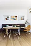 Kjøkkenet har egen spiseplass som ligger bak en halvhøy vegg. Ved bordet står en behagelig sittebenk, og rundt står ulike designstoler.