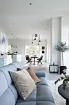 Løsningen med kjøkken og stue i ett gir en god romfølelse og flyt, samt gjør det lett å være sosial. Det lyse rommet og de duse fargene på innredningen skaper en fredfylt atmosfære. Samboeren til Cathrine ønsket seg en ordentlig god sofa, og løsningen ble denne modellen fra Stressless.