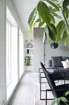 I underetasjen ligger husets andre stue. Denne er det barna som bruker mest, og deres soverom og felles bad ligger også i denne etasjen. Teppet er fra Trendcarpet, sofaen fra Møbelringen og bordet fra Zara Home. Den vegghengte lampen fra Umage Design utgjør en lekker detalj i rommet. Også underetasjens stue har store vinduer vendt ut mot omgivelsene. En frodig plante bryter fint med det ellers dempede interiøret. Innfelte takspotter sørger for godt lys når det naturlige dagslyset forsvinner om kvelden.