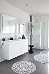 For en familie på fem er det praktisk med dobbeltvask og romslig dusj, i tillegg til badekar, alt fra Vikingbad. Krakken er fra Ellos og mattene fra HK Living.