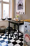 - Et annet favorittmøbel er det dreide pæretrebordet på kjøkkenet. Det er over 200 år gammelt. Bordet stod i hagen til barndomshjemmet mitt og råtnet. Jeg reddet det og malte det i svart bengalakk.