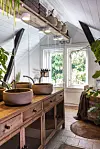 GJENBRUK: Her er det valgt gjenbruk og kreative løsninger for at det skal bli et rimeligere bad. Servantene er terrakottapotter, og hylla over speilet er en gammel bærebjelke de har tatt ned.Lise M. Stang-Jacobsen,