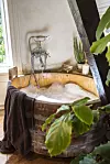 Badekaret er en gammel, stor badestamp de fant på nett. Den er beholdt slik den var, men har fått røropplegg og blandebatteri. De har ikke hatt noe problemer med den, og håper den kan stå der lenge.