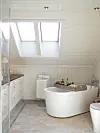 UTSIKT MOT HIMMEL. Badekaret er plassert midt på gulvet under takvinduet. Her er det utsikt til himmel og stjerner. Karet er kjøpt hos Hvalstad Rør i Asker.FOTO: Ragnar Hartvig