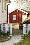 Rundt deler av hagen har paret satt opp dekorative og praktiske gjerder som de har lagd selv av kapp fra tomta. De er også fine å støtte opp blomster med. Gjenbruk og å ta vare på ting fra tidligere generasjoner, er en tankegang som familien liker godt.