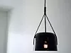 MØRKT LYS: In Darkness har Øyvind Wyller kalt lampen som ble vist på Wallpaper Handmade-utstillingen. Stemningen skapes av en mørk glass-skjerm, skinnremmer og en glødelampe i enden av en tekstilkledd ledning. Pendelen er laget i samarbeid med Magnor.FOTO: Produsent