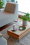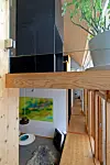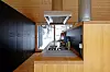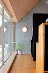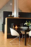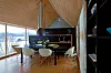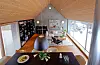 - Taket er en sandwichkonstruksjon av limtre, finer og heltre. De to elementene strekker seg mellom to betonggavler, også prefabrikkerte. En slik konstruksjon gir nødvendig stabilitet, sier arkitekt Knut Hjeltnes. Nesten alle innvendige flater har fått stå ubehandlet slik at de ulike materialene huset består av synes innvendig. Knut Hjeltnes tegnet også kjøkkeninnredningen, bokhyller, senger og skap til huset.