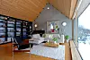 Et annet karakteristisk trekk ved dette hyggelige, moderne huset er det selvbærende, V-formede taket i massivtre. Det ble prefabrikkert og kom til tomten i to deler, der ble heist på plass med en kran.