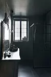 – Etter at skaden var reparert, måtte badet pusses opp fra bunnen igjen. Jeg hadde lyst på noe annet enn hvitt eller beige, og jeg kom over en utstilling med store, mørke fliser hos Flisekompaniet. Det inspirerte meg til å skape et svart bad med detaljer i kobber og mørkt treverk.