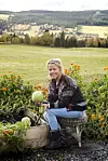 Hun viser stolt frem en hodekål. Rundt henne bugner det av sommerblomster og stauder, som ikke har gitt etter for den kjølige høstluften.