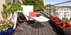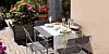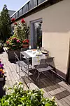 Terrassen har to innganger, en fra entreen og en fra kjøkkenet. Møblene er arrangert i én hvilegruppe som vender mot sjøen, og en spiseavdeling organisert omkring et minimalistisk stålbord fra danske Bent Krogh. Til dette bordet har han satt lette stålstoler fra samme produsent, som ikke virker dominerende mot det elegante bordet.