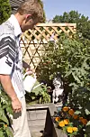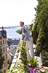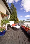 - På den store terrassen spiser vi frokost og kvelds, mens middagen inntas på den noe mindre, på den andre siden av leiligheten. Den er svalere enn den store midt på dagen. Vi bor bokstavelig talt på disse terrassene om sommeren, forteller Kinn. Ellers preges takhagen av frodige busker, blomster og ulike krydderurter. De er nøye utvalgt, slik at det blir en stadig veksling i blomstringen gjennom hele sommeren. Her finnes eple-, kirsebær- og plommetrær, bringebær, jordbær, sukkererter, tomatplanter, stikkelsbær og rips.