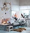 Skinnfeller, levende lys, lysslynger, snøkrystaller i papir, lerkekvister med kongler og reinsdyrhorn skaper også julestemning i boligen.