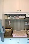 Innredningen er fra kjøkkenavdelingen på Ikea. Den har blitt tilpasset av en snekker, og eierne har deretter malt den i en lys farge, med helmatt finish.